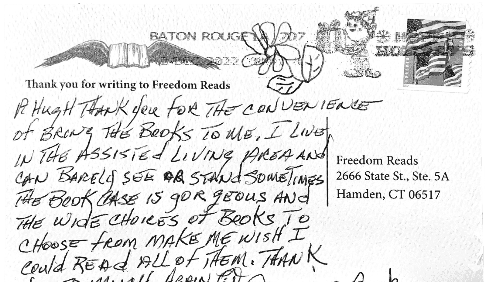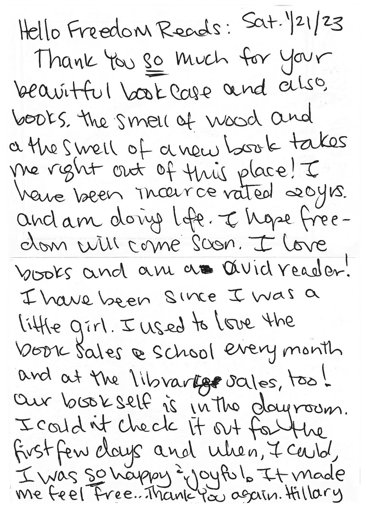 The smell of wood and the smell of a new book takes me right out of this place! I have been incarcerated 20 yrs. and am doing life. … I love books and am an avid reader! I have been since I was a little girl. … Our bookshelf is in the dayroom. I couldn't check it out for the first few days and when I could, I was so happy and joyful. It made me feel free...Thank you again.