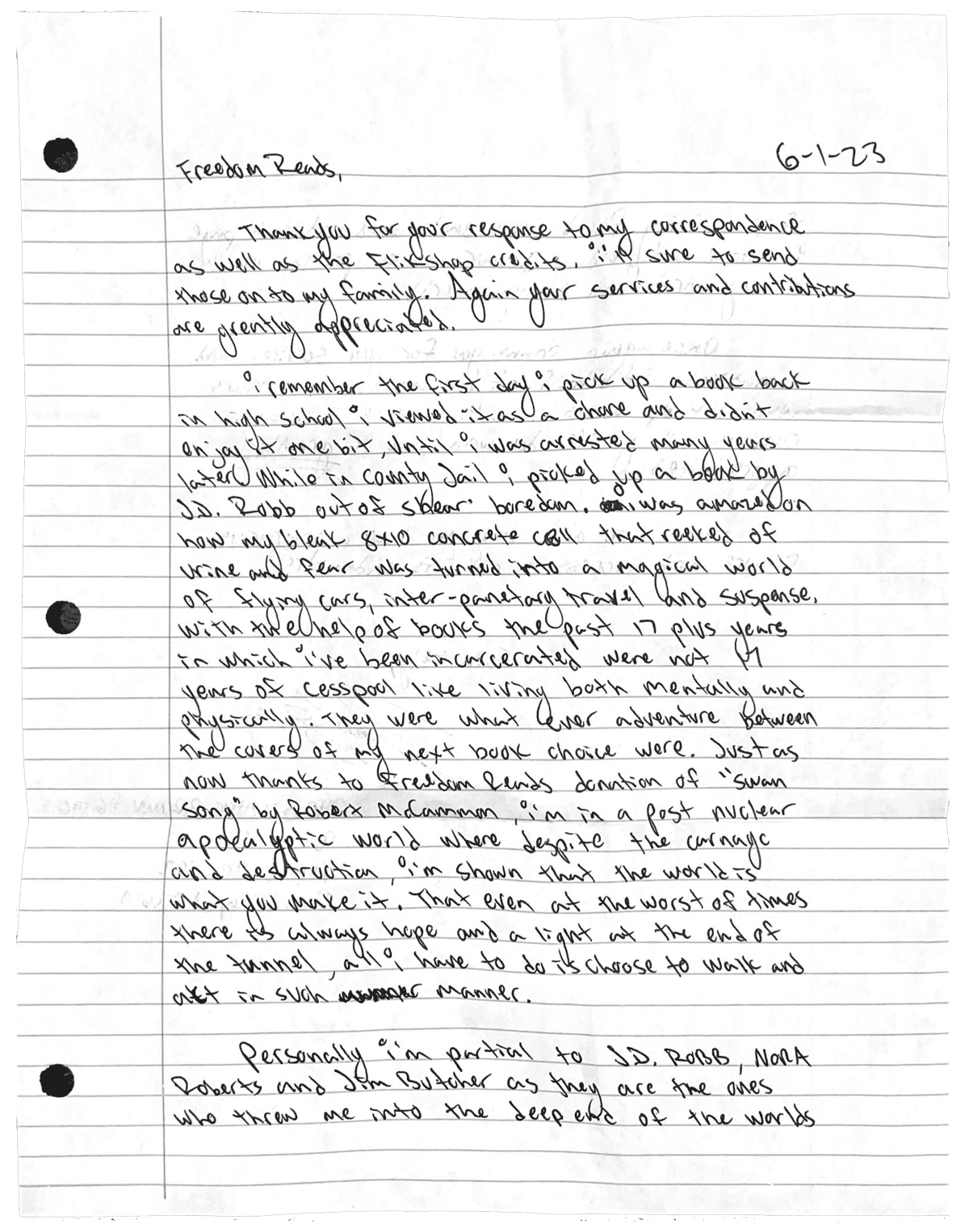 I remember the first day I picked up a book back in high school I viewed it as a chore and didn’t enjoy it one bit, until I was arrested many years later. While in county jail I picked up a book by J.D. Robb out of sheer boredom. I was amazed on how my bleak 8x10 concrete cell that reeked of urine and fear was turned into a magical world of flying cars, interplanetary travel and suspense. With the help of books the past 17 plus years in which I've been incarcerated were not 17 years of cesspool like living both mentally and physically. They were whatever adventure between the covers of my next book choice were. Just as now thanks to Freedom Reads donation of "Swan Song" by Robert McCammon, I’m in a post nuclear apocalyptic world where despite the carnage and destruction, I'm shown that the world is what you make it. That even at the worst of times there is always hope and a light at the end of the tunnel, all I have to do is choose to walk and act in such manner.
