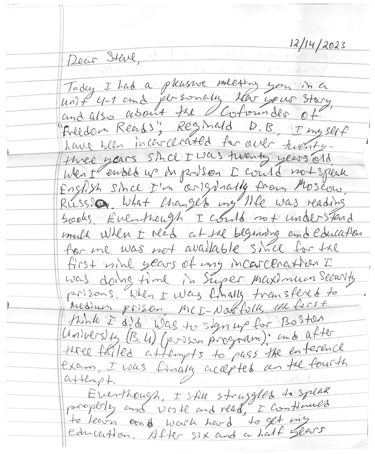I myself have been incarcerated for over 23 years since I was 20 years old. When I ended up in prison I could not speak English since I’m originally from Moscow, Russia. What changed my life was reading books. ... Nowadays, besides being an author, a poet, I have also become an activist, and an educator. My goal is to bring awareness to the public that there are prisoners who have changed their lives because of education. … I like to share my story with everyone whether that person is a politician, correctional officer, a prisoner, religious or atheist. Since at the end of the day we are all human beings who try to evolve and become better.