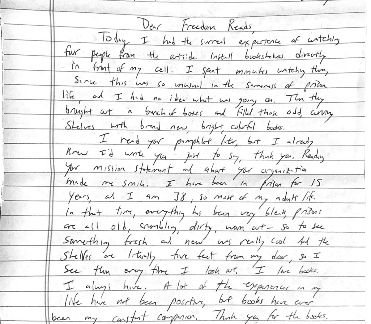 Today I had the surreal experience of watching four people from the outside install bookshelves directly in front of my cell. I spent minutes watching them, since this was so unusual in the sameness of prison life, and I had no idea what was going on. Then they brought out a bunch of boxes and filled those odd, curvy shelves with brand new, bright, colorful books. ... I have been in prison...most of my adult life. In that time, everything has been very bleak, prisons are all old, crumbling, dirty, worn out - so to see something fresh and new was really cool. And the shelves are literally five feet from my door, so I see them every time I look out. I love books. I always have. A lot of the experiences in my life have not been positive, but books have ever been my constant companion. Thank you for the books.