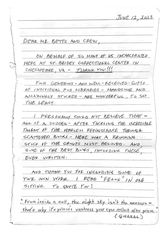 On behalf of so many of us incarcerated here at St. Brides Correctional Center in Chesapeake, VA–Thank You!!! Your generous–and well-received–gifts of individual pod libraries–handsome and amazingly stocked–are wonderful, to say the least. I personally could not believe that–all of a sudden–after tackling the incredible talent of the Harlem Renaissance through scattered books–here was a brimming stock of the group’s most beloved. And, some of the best books, including these, ever written.
